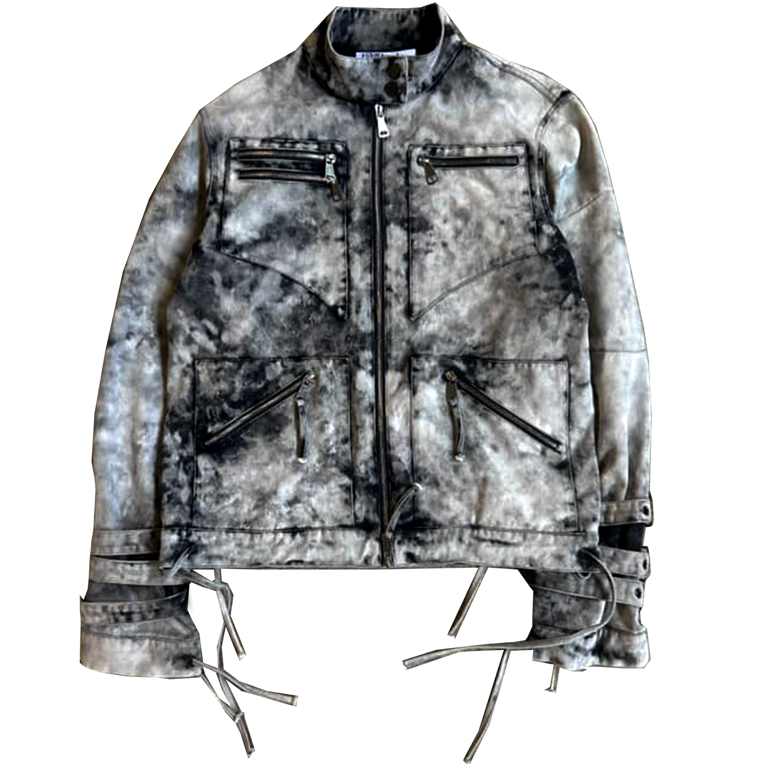 FaceWired FW25 Moto JKT — Cut from 8.26oz cotton twill, enzyme-washed and finished with a hand-applied black acrylic overdye. Each piece is unique — no two are exactly alike.